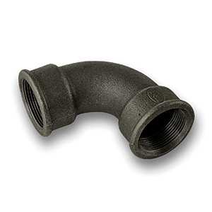 A FM Approved malleable iron 90° female BSPP thread to female BSPP thread short bend in black finish to BS EN 10242. Also available in galvanised finish.