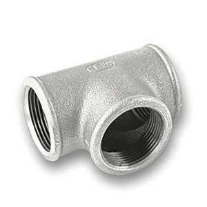 A FM Approved malleable iron female BSPP thread equal tee in galvanised finish to BS EN 10242. Also available in black finish.