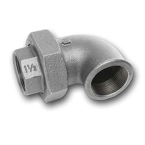 A FM Approved malleable iron 90° female BSPP thread to female BSPP thread union elbow in galvanised finish to BS EN 10242. Also available in black finish.